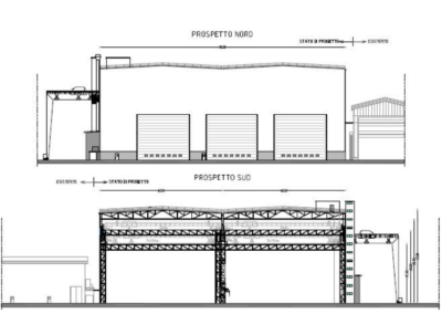 Sul fronte nord invece saranno presenti esclusivamente n. 3 aperture per il passaggio dei mezzi che saranno dotate di serramenti di tipo a pacchetto.